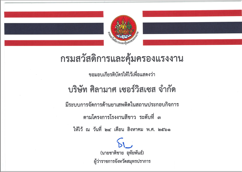 Renewable Energy Service Co., Ltd. received a certificate of recognition level 3 in the implementation of the policy. “Clean factory (Drug free) certificate. Under the regulations of the Department of Labor Protection and Welfare, which is a measure to prevent and resolve drug problems in the workplace, the company has consistently followed the guidelines and conditions. They are also successful, such as health checks, organizing drug testing processes in order to provide employees with sustainable mental health and good quality of life, and to be a truly drug-free establishment.